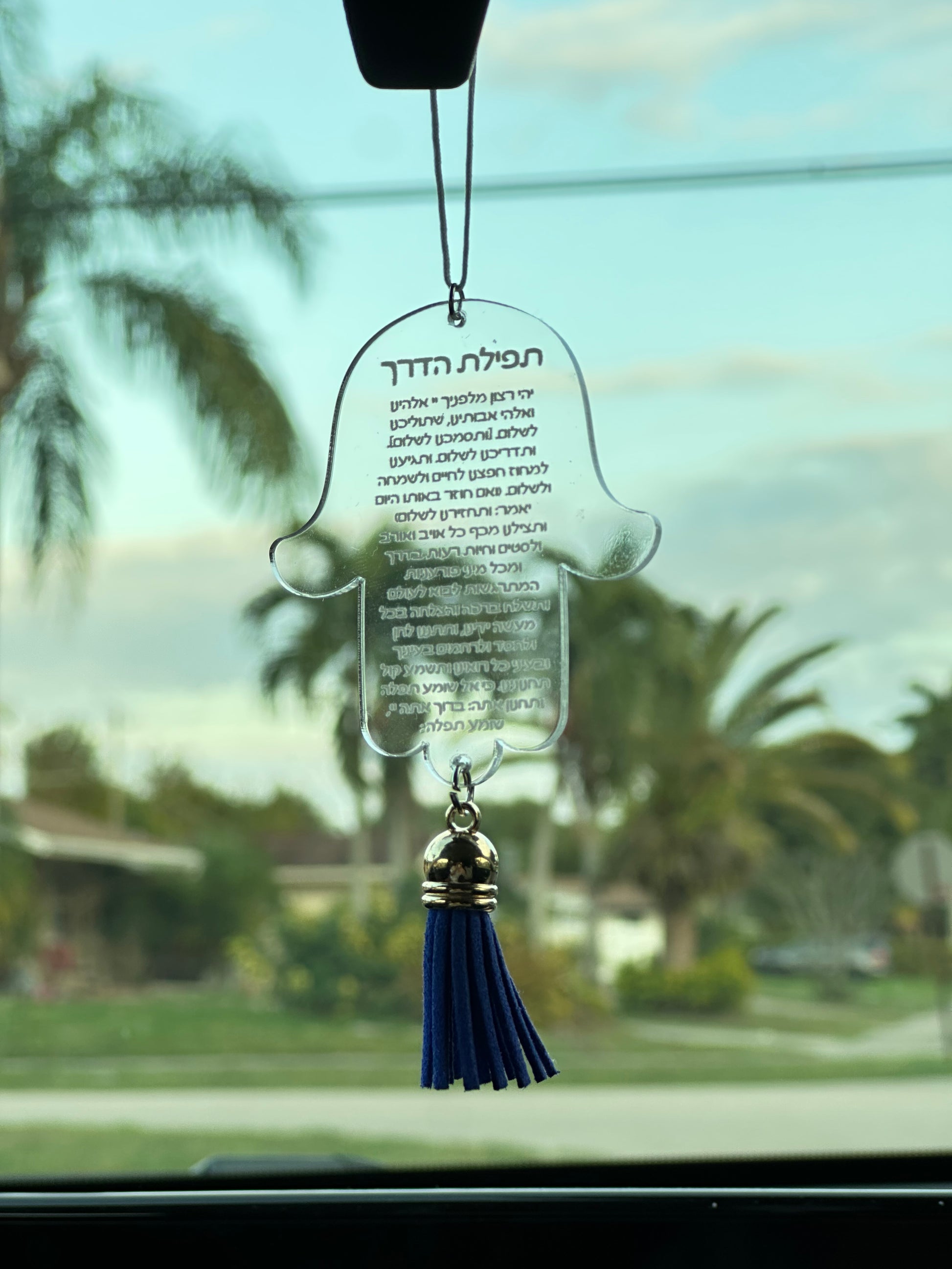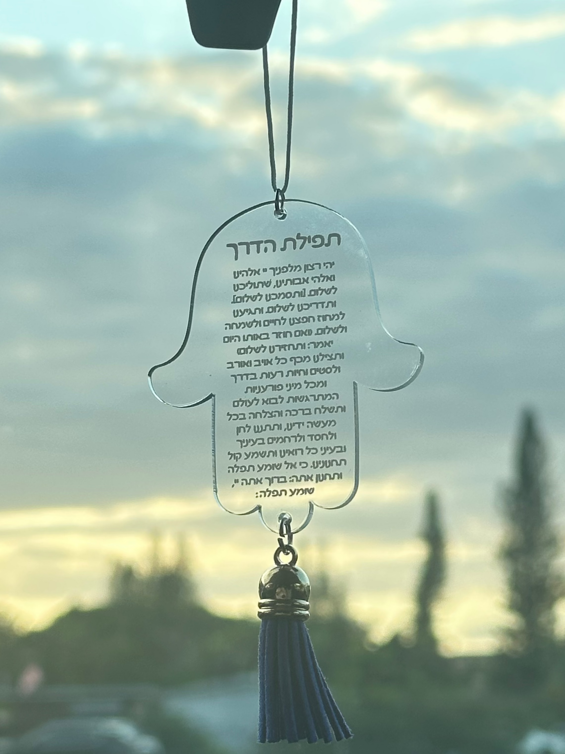 A meaningful Traveler’s Prayer designed for hanging in the car, crafted from clear plexiglass in a Hamsa shape with white, clear, and easy-to-read Hebrew text.